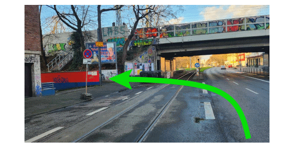 Vom Stadtzentrum kommend, kurz vor der Unterführung links von der Aachener Strasse abfahren.