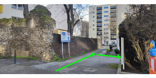Parkplatz frei zugänglich. Zufahrt über die Griechenpforte 46 (gegenüber von der Pizzeria Trattoria Sorrentino ve Suvio).