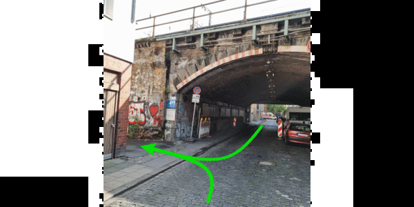 Zwei Einfahrtsmöglichkeiten. In die erste Einfahrt links einfahren und unter dem ersten Bahnbogen parken. Um unter dem zweiten Bahnbogen zu parken muss durch die Hinterseite eingefahren werden.