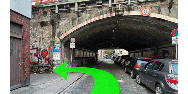 Einfahrt 1. Fläche: Links abbiegen in die erste Gasse und danach rechts unter den ersten Bogen fahren.